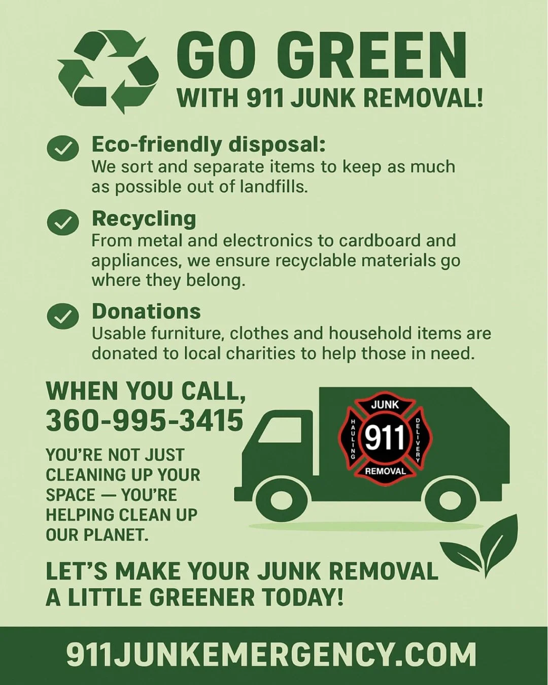 We care about the environment and the community we serve. At 911 Junk Removal, we take every step to ensure junk is disposed of responsibly. Reusable items are donated to local charities, and recyclable materials like metal, cardboard, and electronics are processed through certified recycling facilities.